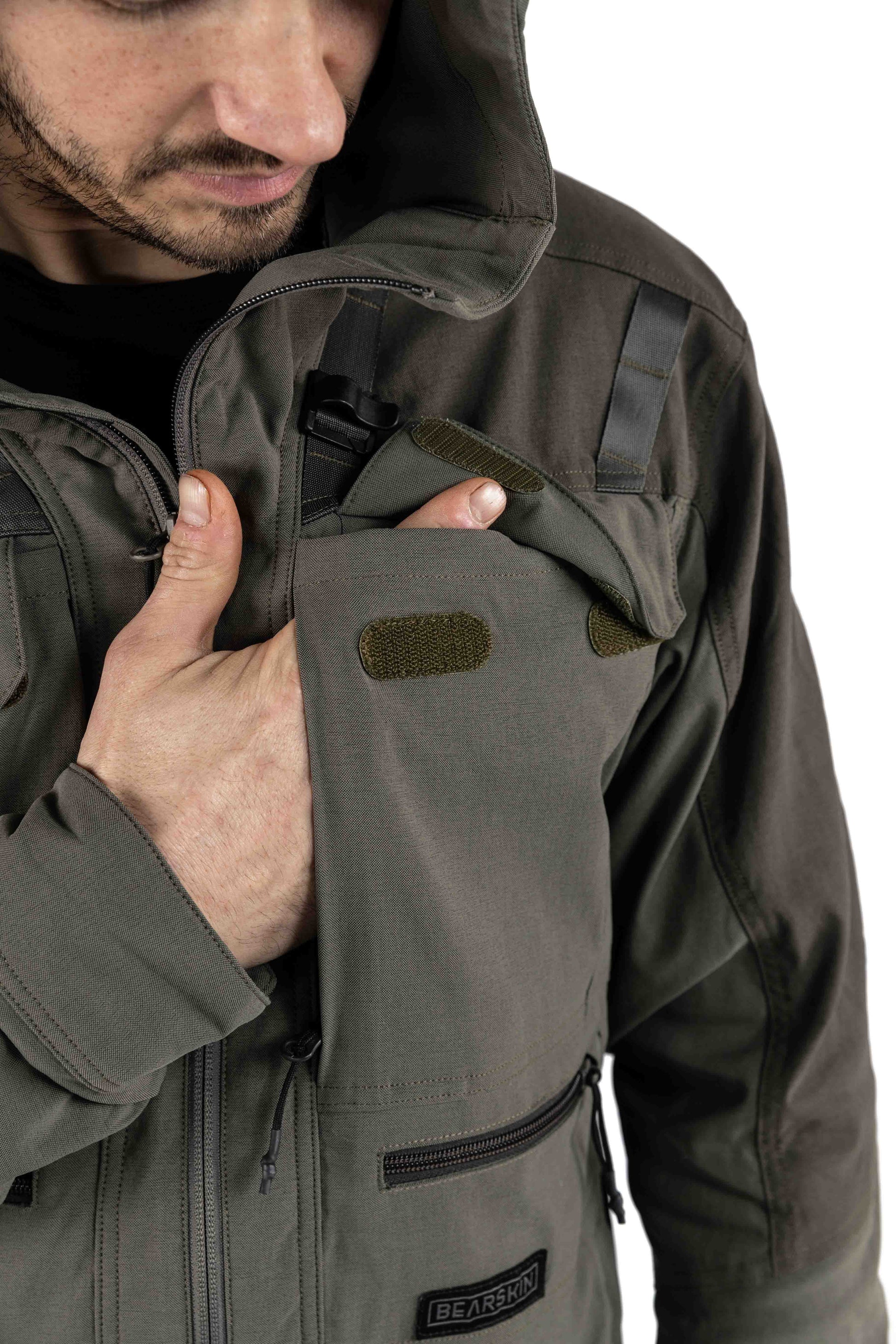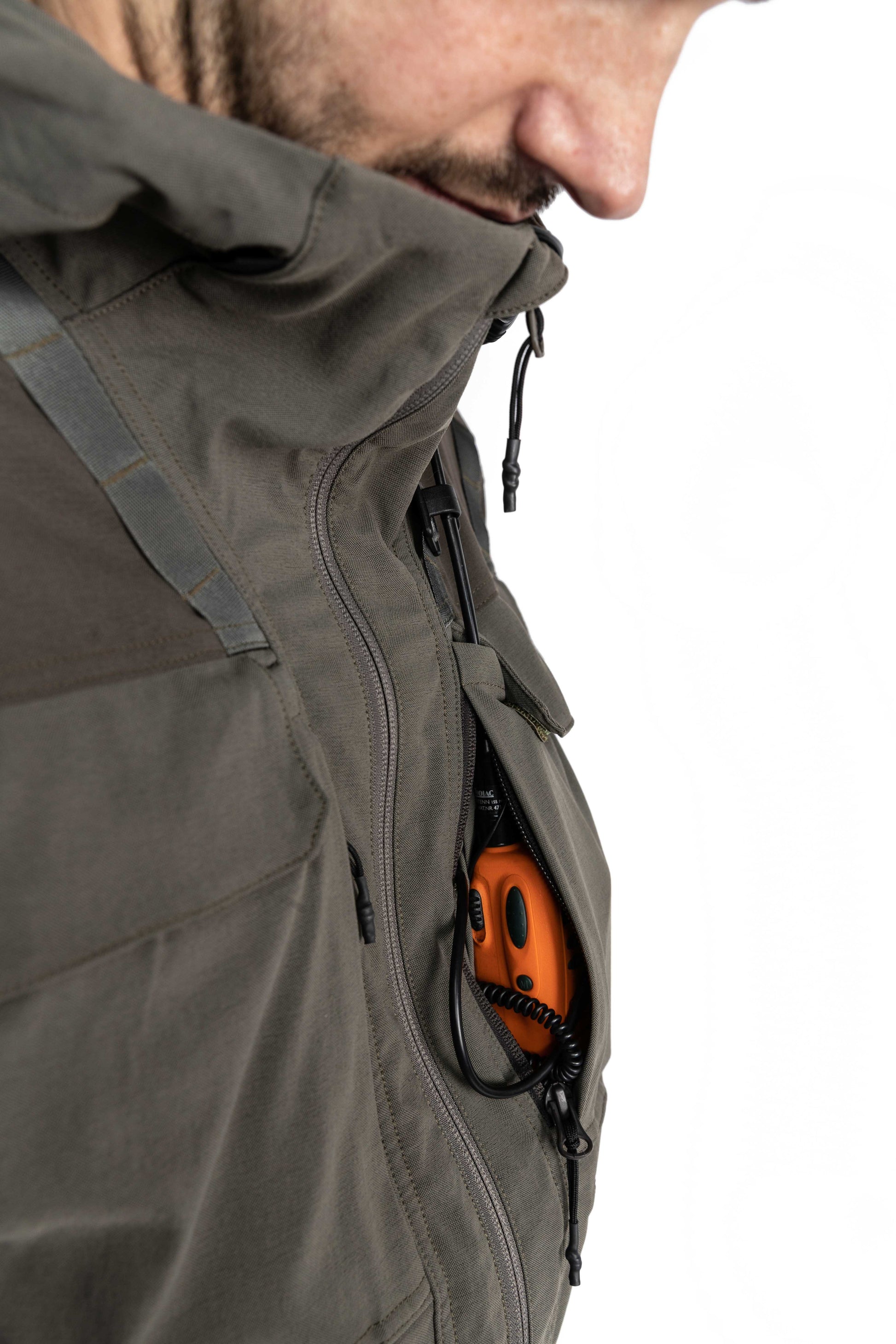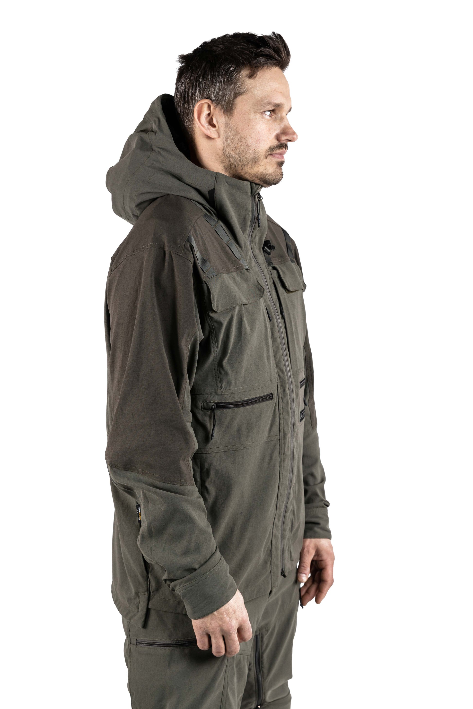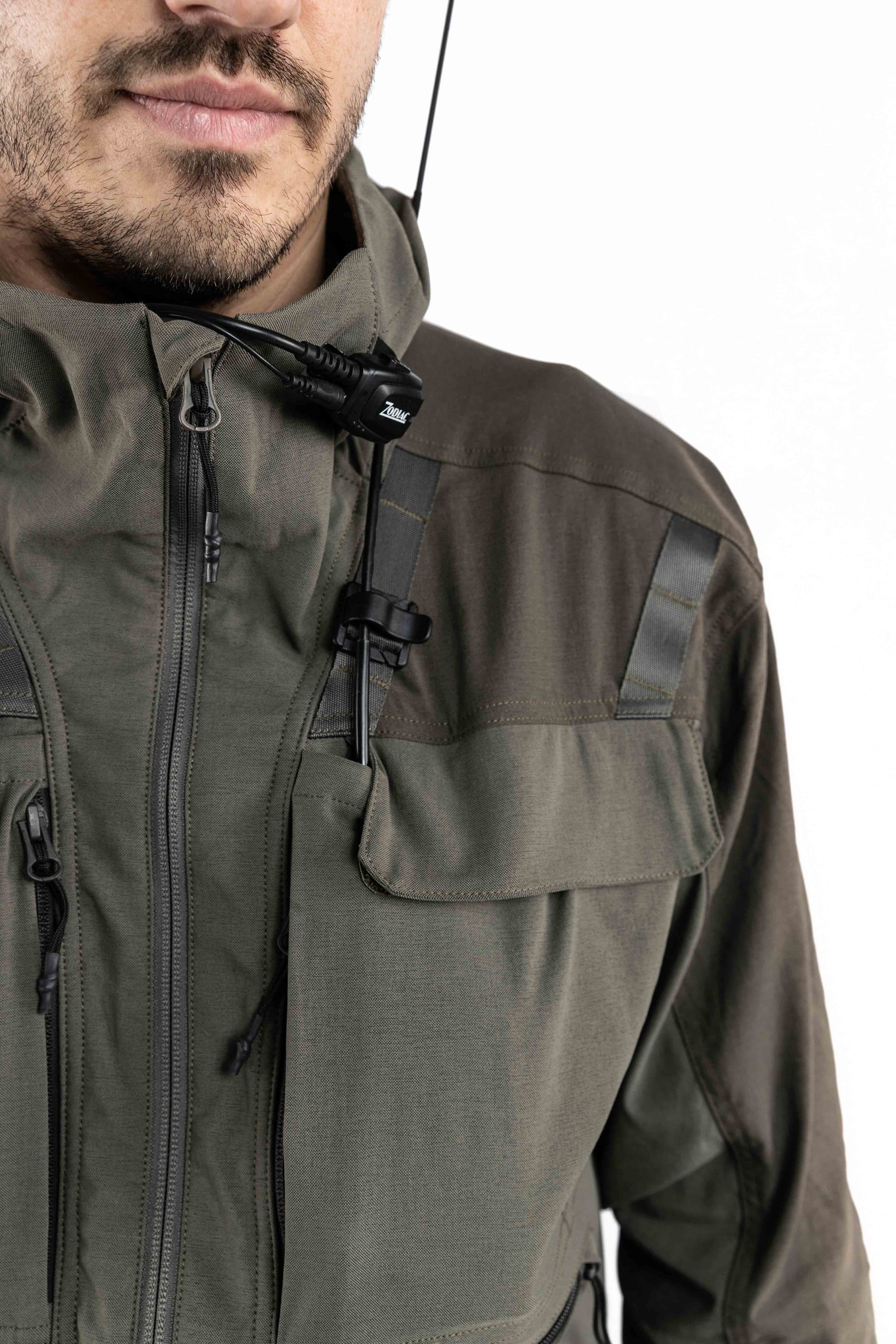 Utrustad med en tvåvägsjusterbar huva, en robust hängare på baksidan och ett fäste för radiomikrofon på varje sida, är Cordura-jackan det självklara valet av praktisk komfort. Med två bröstfickor, två små horisontella utrustningsfickor och två stora handfickor samt ryggficka kan du enkelt ta med dig alla dina jakttillbehör.