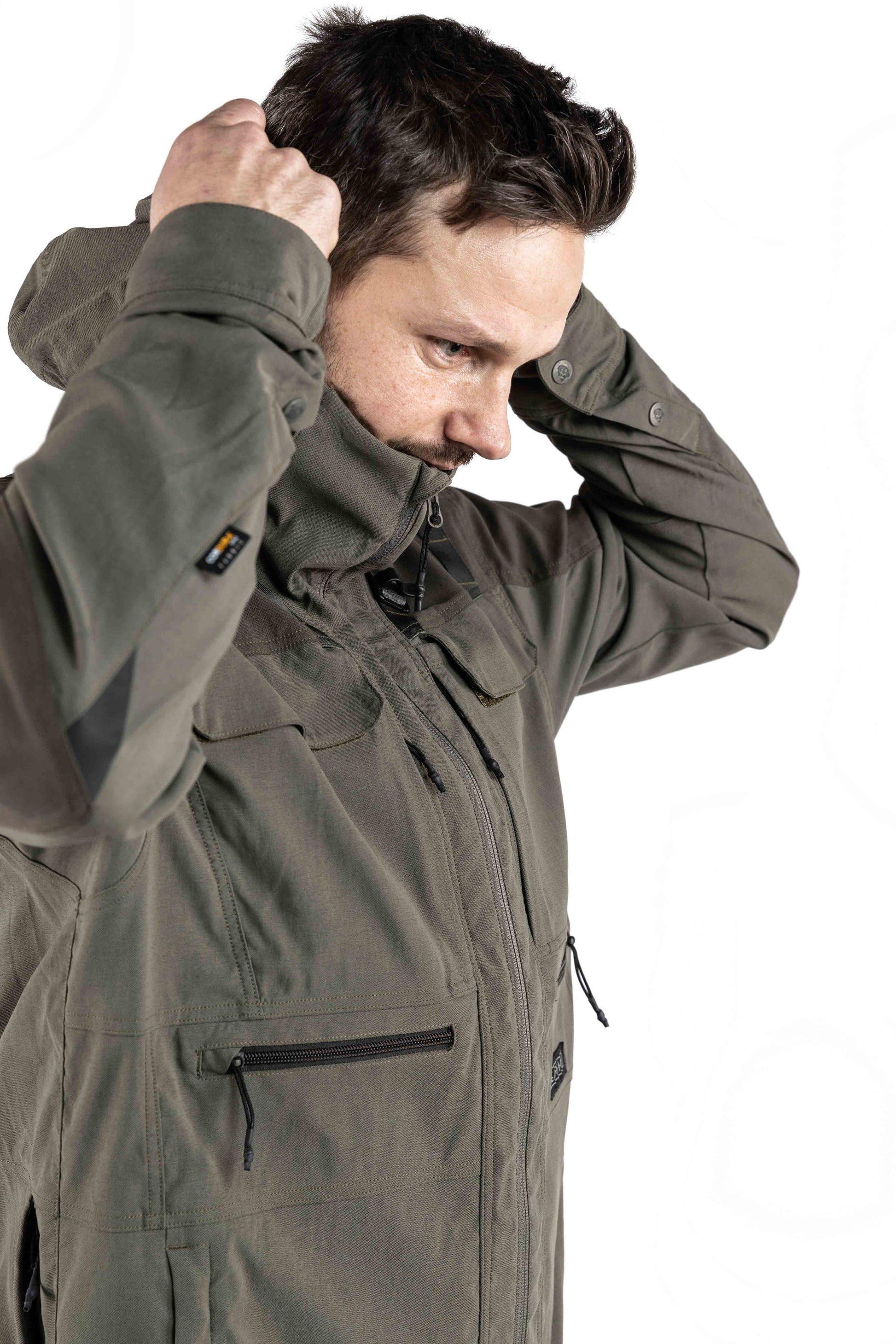 Jackans manschettstängning med tryckknappar säkerställer maximal ventilation, så att du kan hålla dig bekväm under längre jaktäventyr. Och med sina reflekterande detaljer på armarna, den interna ledningen för radiosladden och de vind- och vattentåliga materialet är Cordura Jacket det ultimata valet för jägare som kräver både funktionalitet och komfort.