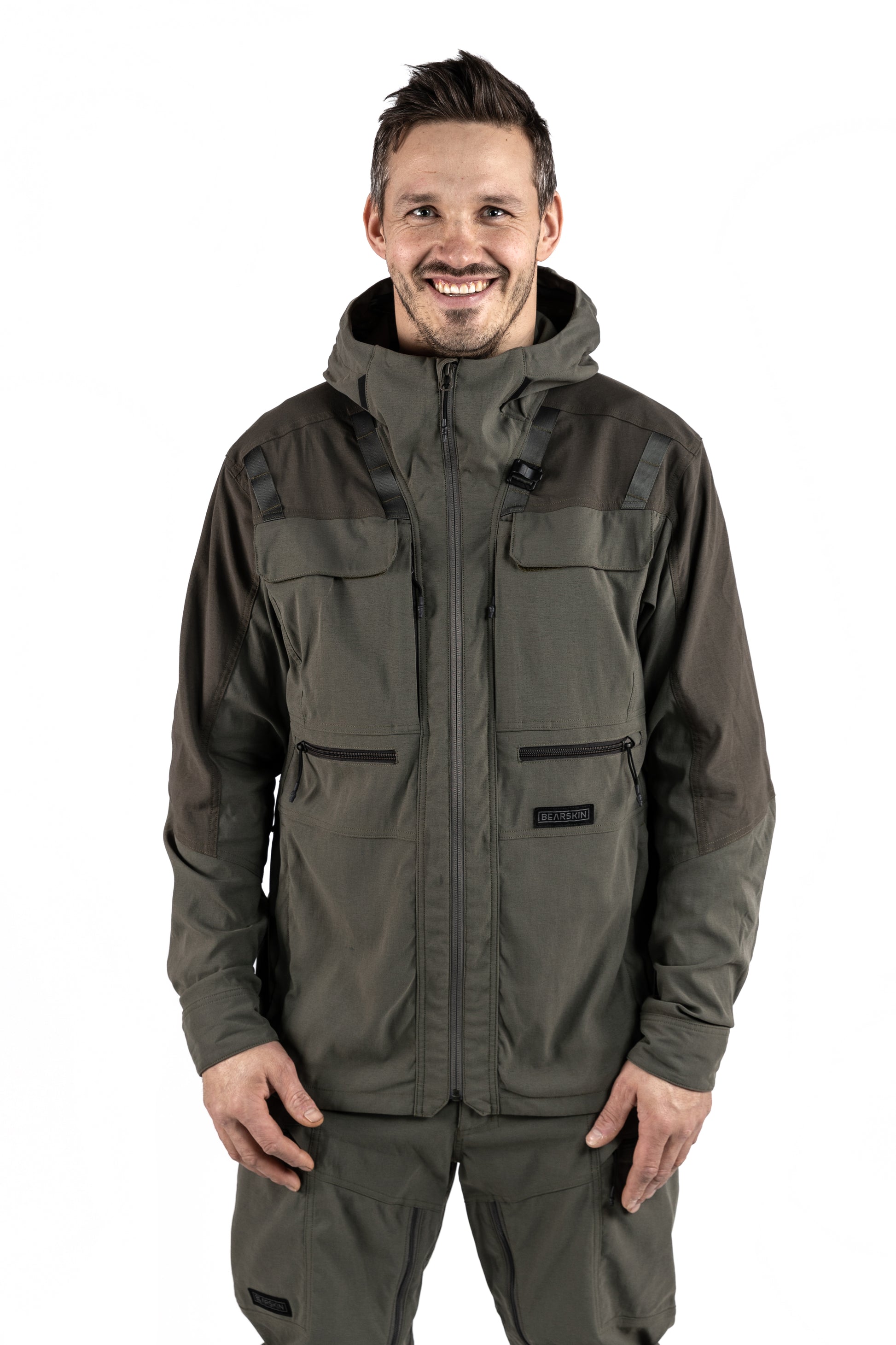 Ett ställ fritt från membran, som andas, torkar och är extremt tåligt. Corduran i stället är tillverkad i Sverige, den har en vattenavvisande behandling men den är inte vattentät, varken när du svettas eller har blivit blöt och behöver torka effektivt. Stället är lätt, tyst, och följsamt. Jacka och byxa har smarta detaljer för bärande och justeringar. Det är i en för djur och natur i diskreta förlåtande färger men har små reflexdetaljer för att du ska synas när det behövs.
