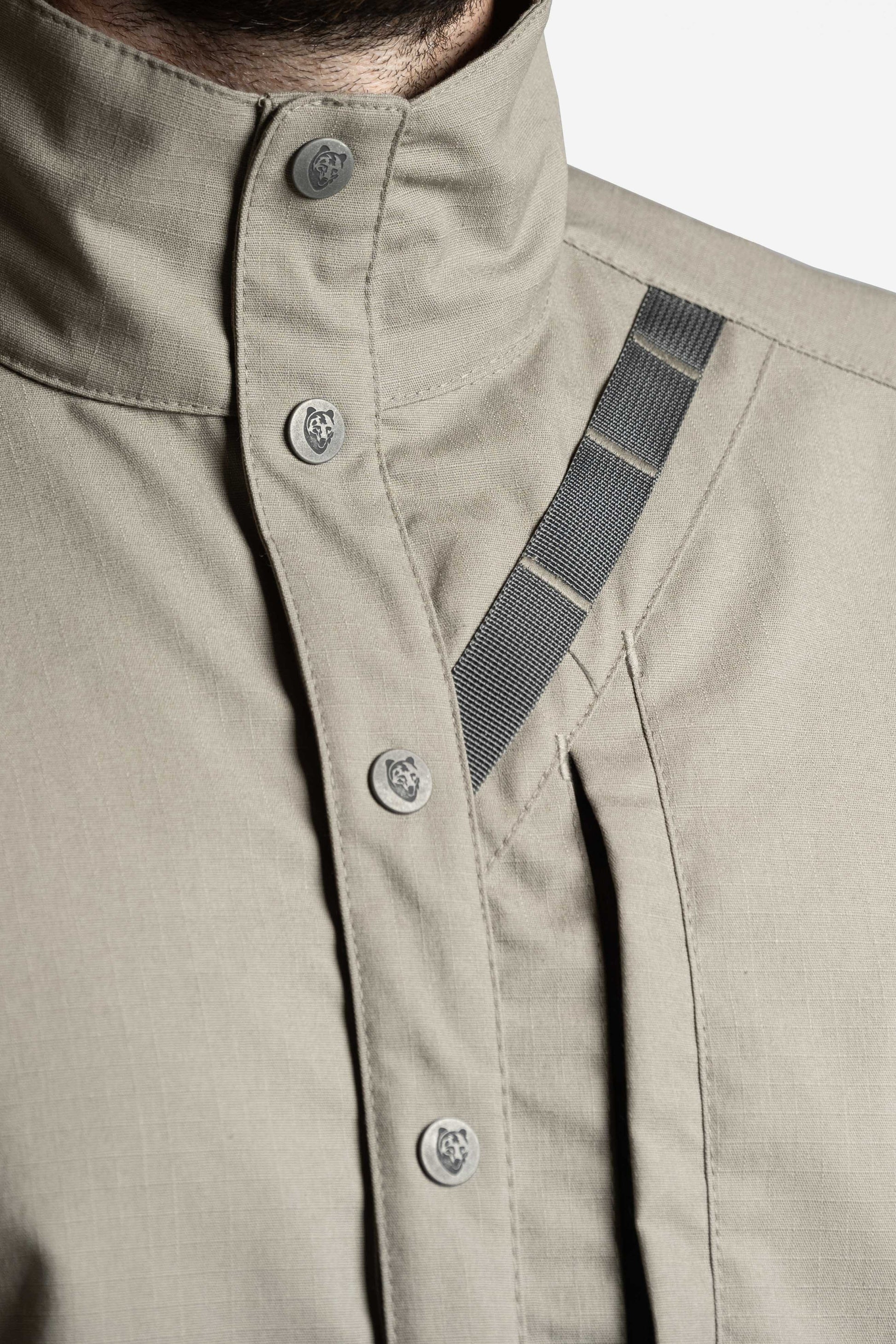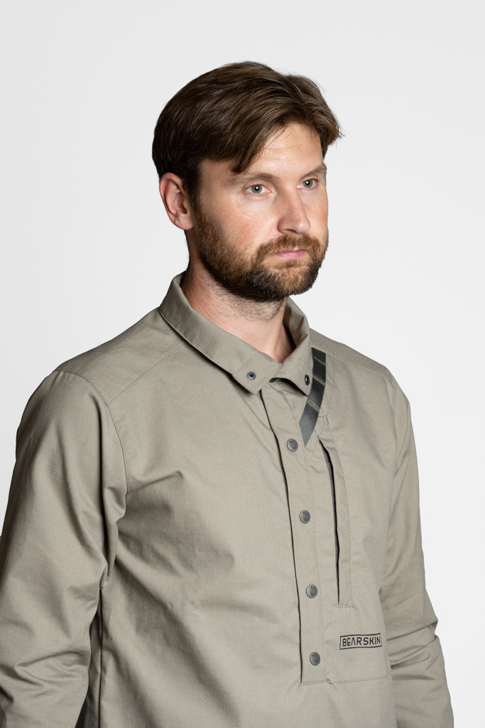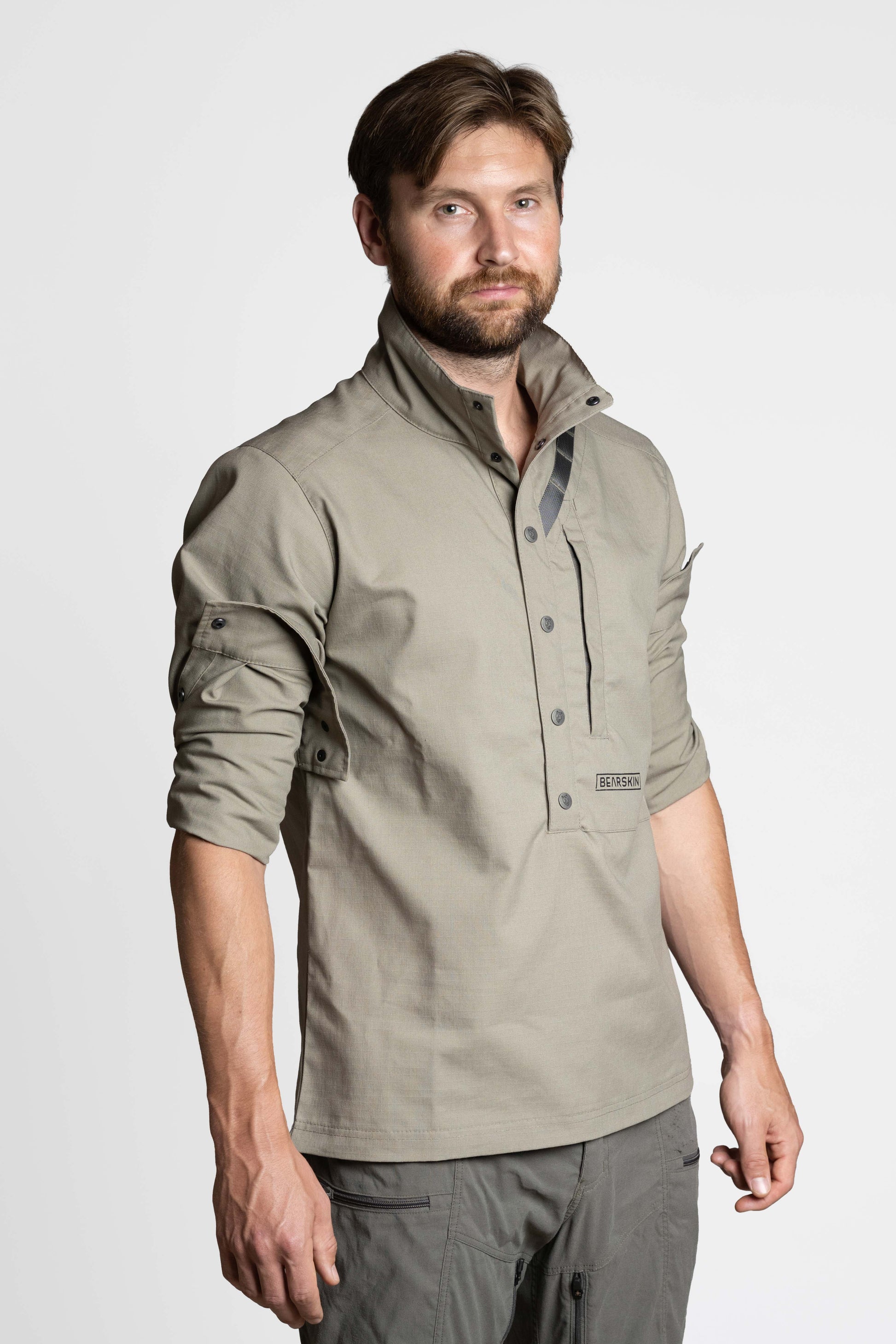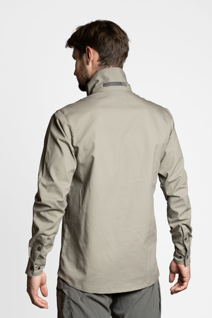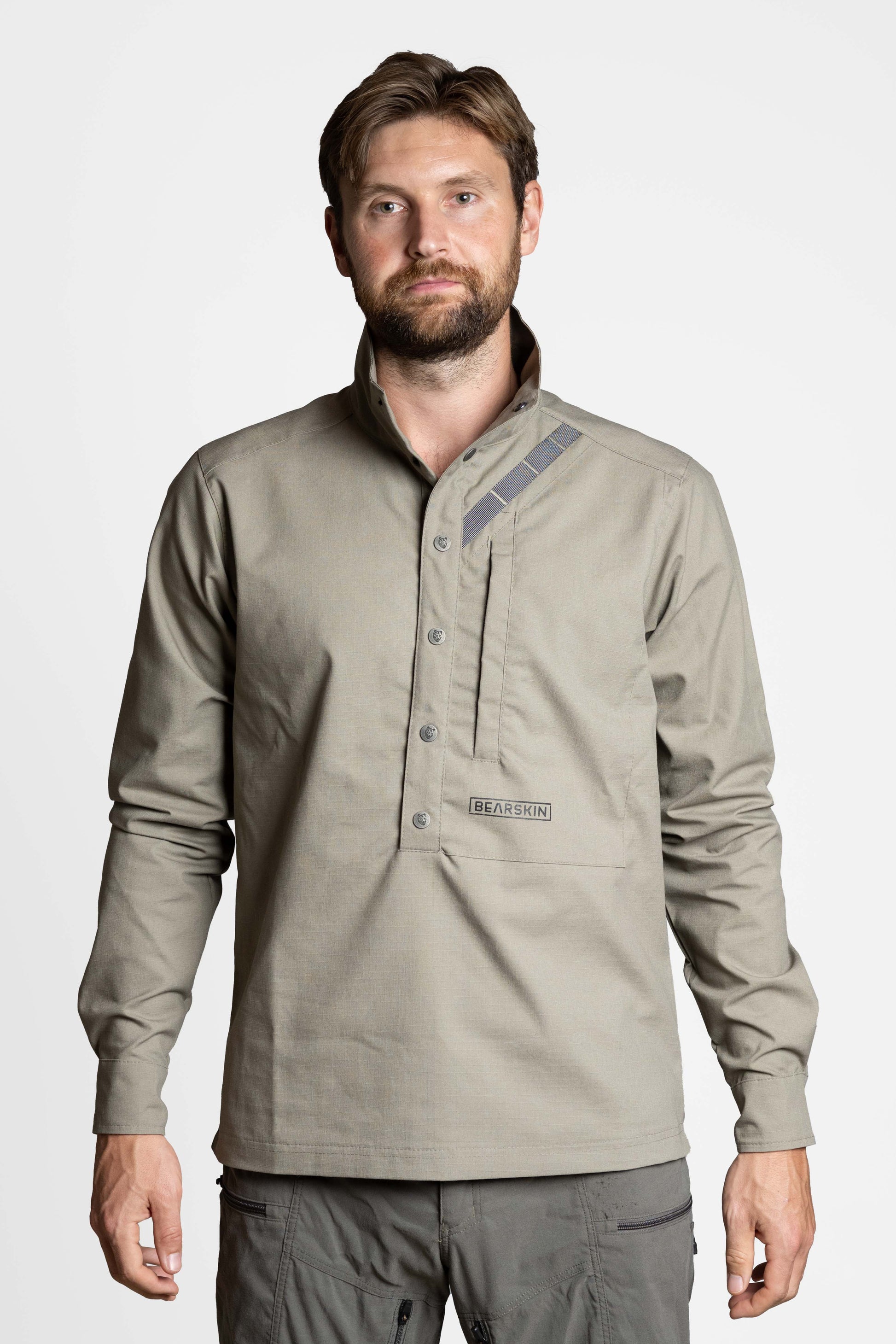 Den är tillverkad i tålig ripstop polyester/bomull och är tänkt som ett tunt ytterplagg eller ett mellanlager som skyddar mot mygg och blåst utan att värma mer än nödvändigt tack vare den smarta designen med halvknäppning och den höga kragen. Skjortans färg är perfekt kamouflerande i många miljöer men går hem i allsköns sammanhang. Designen med en rymlig bröstficka, knäppning upp i halsen och skjortknäppning i ärmsluten gör den till ett riktigt allsidigt plagg utan att kompromissa.