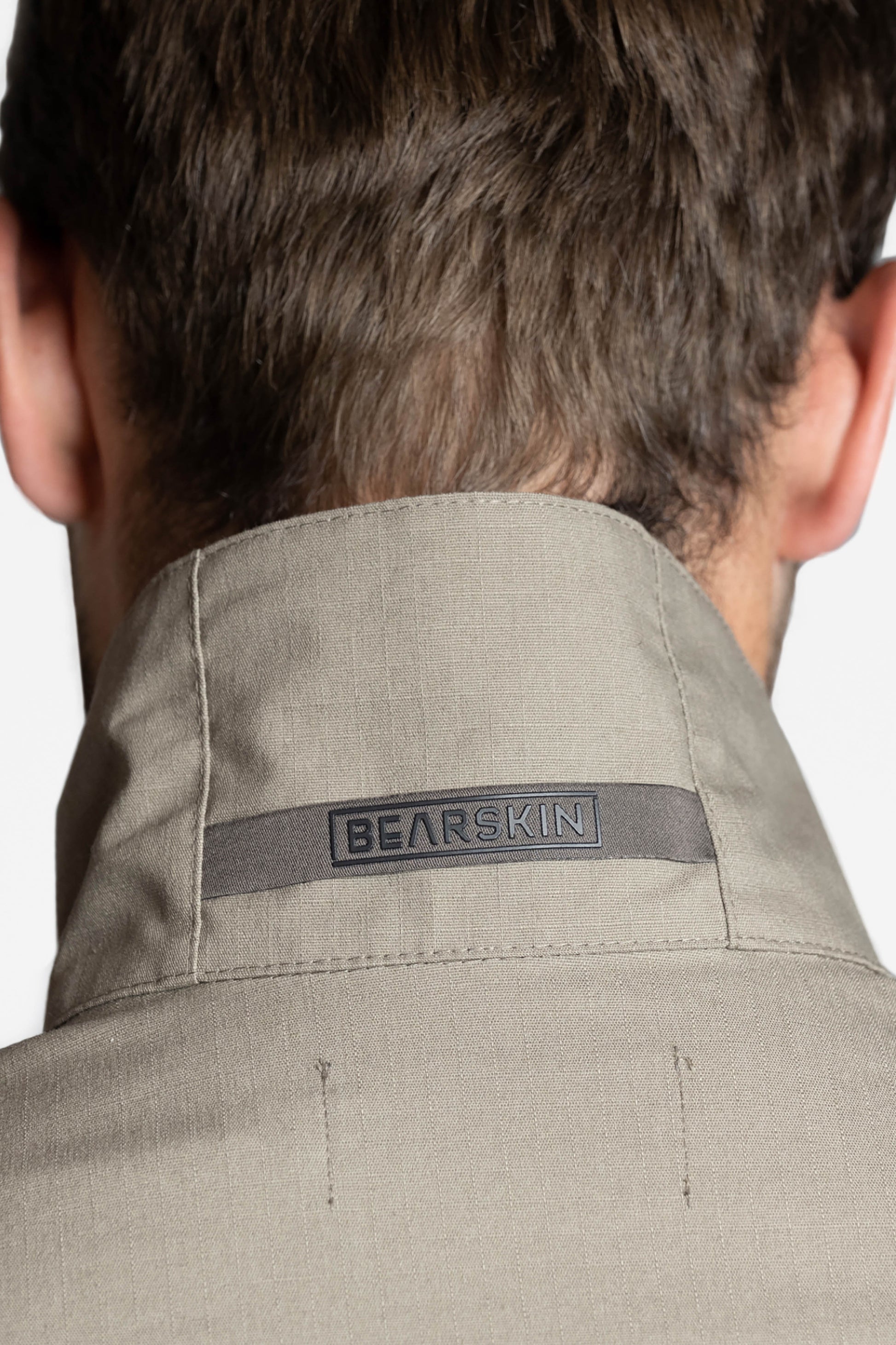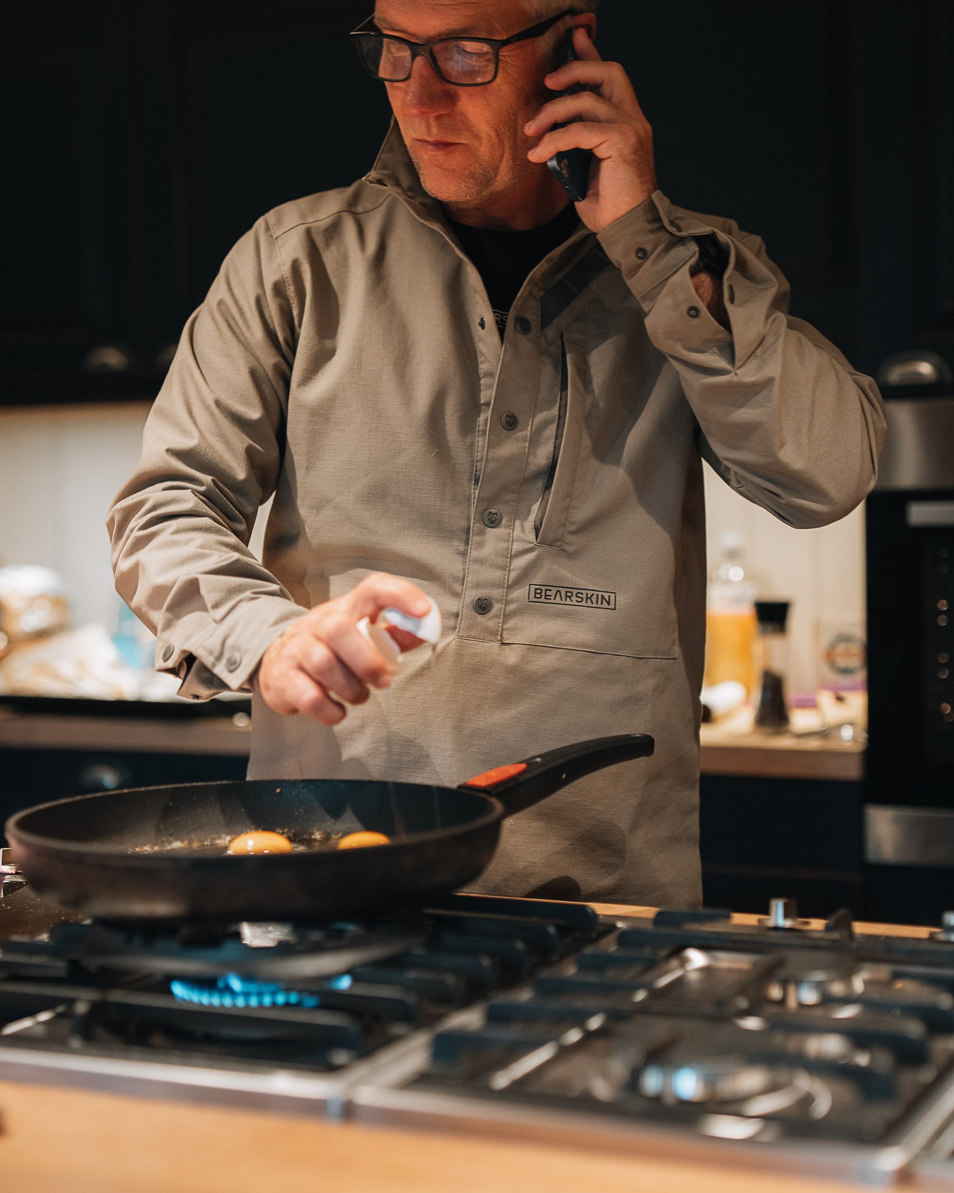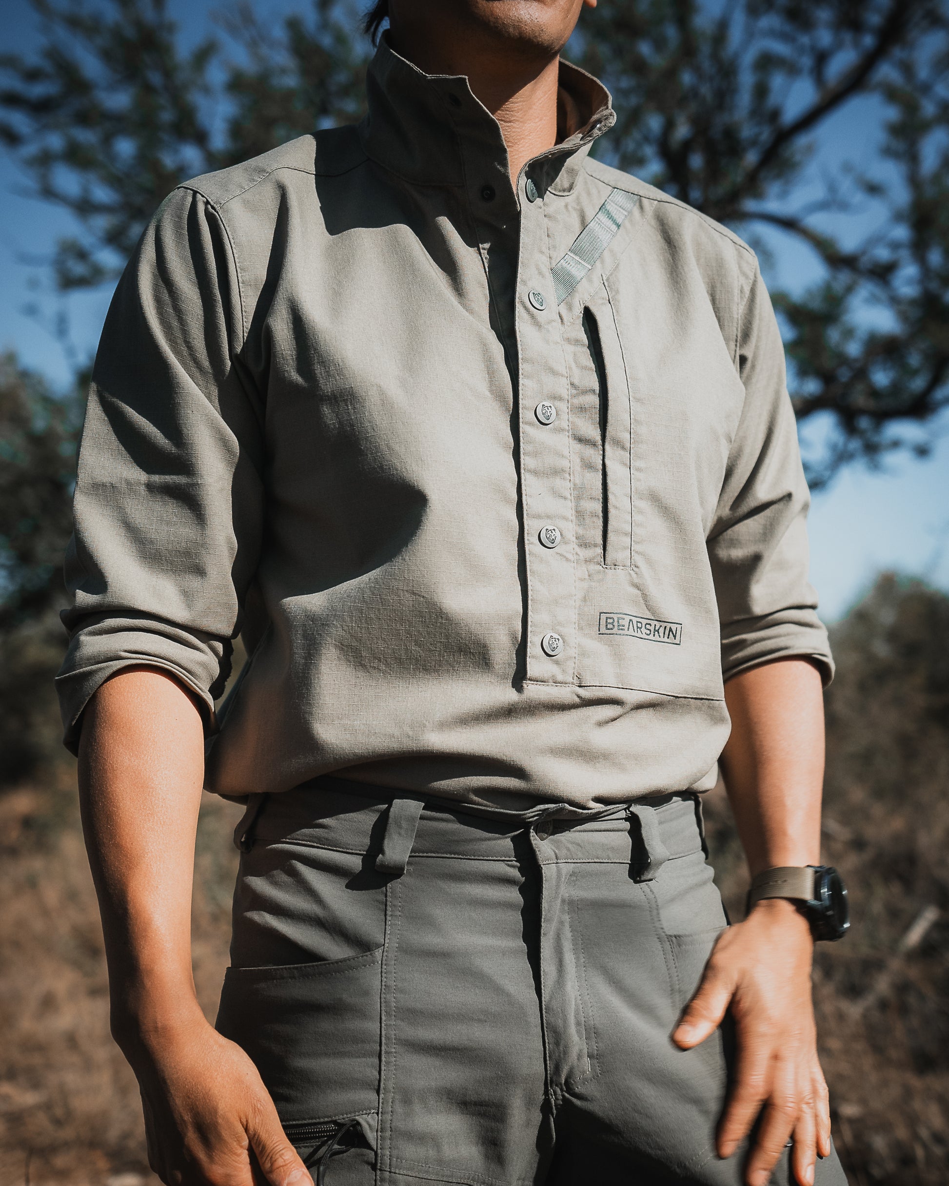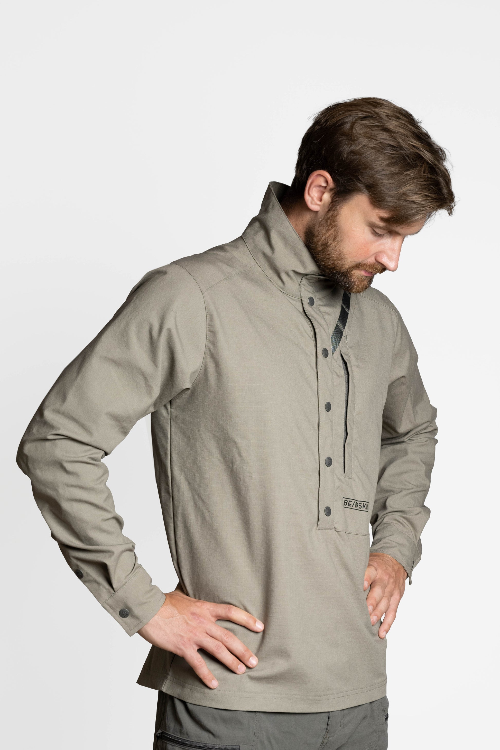 Den är tillverkad i tålig ripstop polyester/bomull och är tänkt som ett tunt ytterplagg eller ett mellanlager som skyddar mot mygg och blåst utan att värma mer än nödvändigt tack vare den smarta designen med halvknäppning och den höga kragen. Skjortans färg är perfekt kamouflerande i många miljöer men går hem i allsköns sammanhang. Designen med en rymlig bröstficka, knäppning upp i halsen och skjortknäppning i ärmsluten gör den till ett riktigt allsidigt plagg utan att kompromissa.
