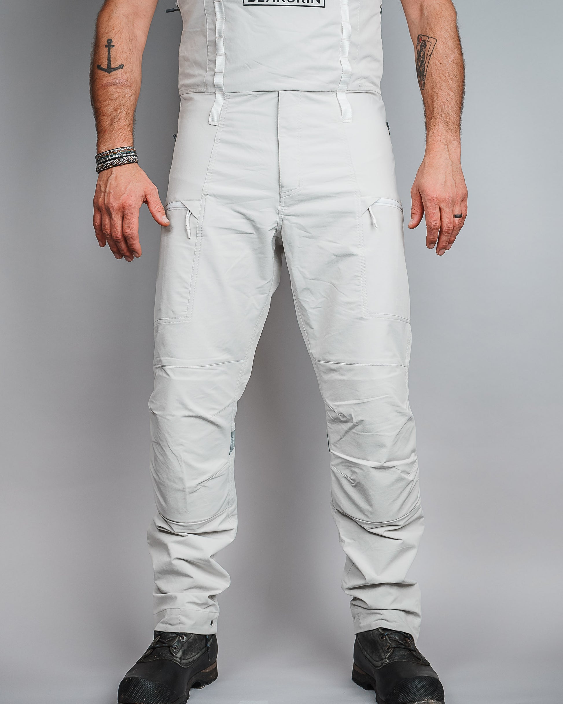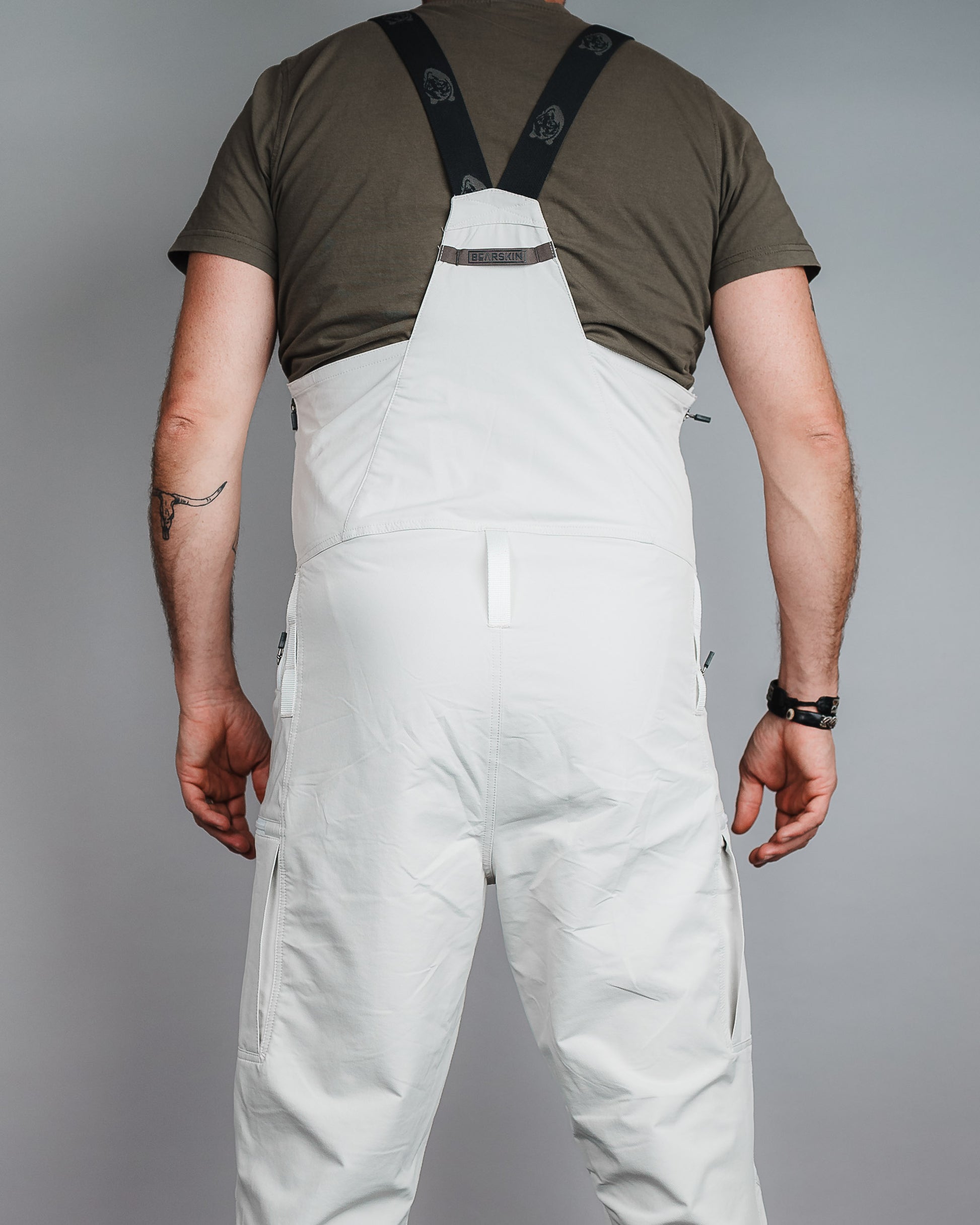 Bearskins Winter Bib Pants, våra hängseljaktbyxor för vinter och snö, är en utveckling av vår otroligt populära Bibbyxa i cordura, med ambitionen att tillföra något nytt även på vinterhalvåret. Byxorna har ventilationsmöjligheter både upptill och nedtill och tanken är att man klär sig efter aktivitet under plagget. I färgen snow white, med ett lätt starkt material som andas bra och torkar snabbt samtidigt som det har bra egenskaper i snö. Tack vare en teknisk design med utrymme på rätt ställen och god passform samt fyrvägsstretch så kan vi presentera ett vinterställ för rörlig jakt som sitter bra men inte är i vägen. Det är inte vattentätt men går att behandla med vattenavvisande produkter som t.ex. vax eller impregneringsmedel.