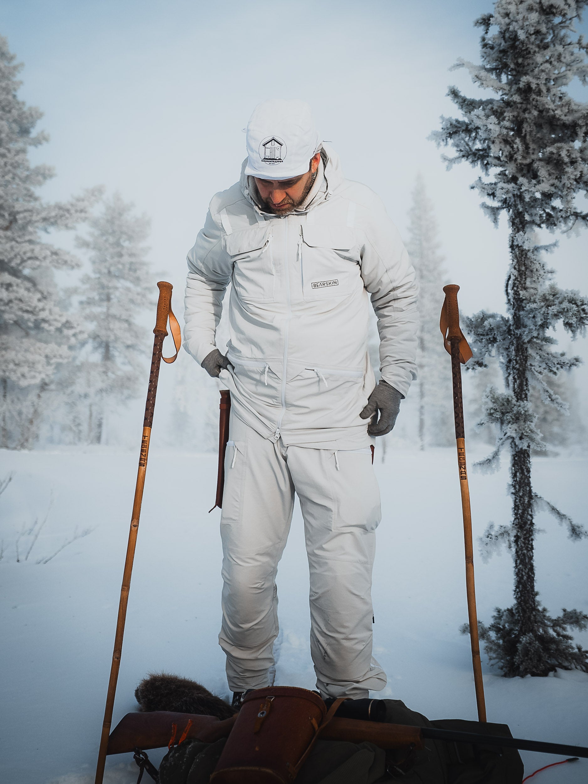 Winter Jacket är designad som en lätt funktionell jacka för jakt i vinterlandskap och vinterklimat. Färgen snow white är ett ypperligt kamouflage och den tekniska designen ger en jacka med full rörlighet utan att bli bylsig eller i vägen. Den är i en något längre model för ökat skydd mot vind och snö, har stora handfickor som rejäla handskar eller t.o.m. en ripa får plats i. Luvan med smart tvåvägsjustering är skön att ha när vinden friskar i eller när upplega blir besvärlig.